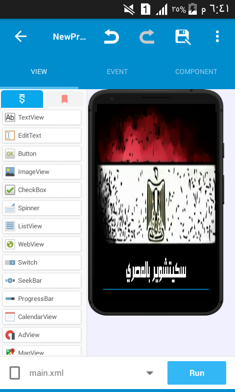 أولا: قم بتصميم مظهر الصفحة كما تحب وتأكد من أنها MainActivity كما بالصورة التالية وتجد طريقة أخرى أسفل الشرح إذا كنت لاتريد mainn activity تكون الأسبلاش او صفحة الترحيب.